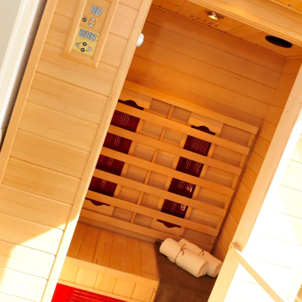 De eerste verdieping is voorzien van een ruimte met een infrarood sauna, een wasruimte met wasmachine en een slaapkamer met twee eenpersoons bedden.